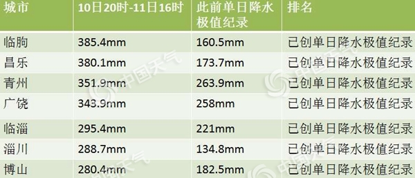 从昨天开始,“利奇马”裹挟着大量水汽在山东制造大范围强降雨。监测显示,从昨天20时至今天16时,强降雨主要集中在山东西部地区,20个小时(不到一天)的时间破单日纪录站点众多,临朐降水量385.4毫米、昌乐降水量380.1毫米、青州降水量351.9毫米、广饶降水量343.9毫米,以及临淄、淄川、博山等地均打破了当地单日降水极值纪录。