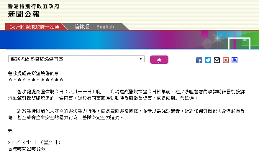 刚刚,香港特别行政区政府官网发布题为《警务处处长探望烧伤同事》的新闻公报,证实一名警员在尖沙咀警署内执勤时被暴徒投掷汽油弹烧伤双脚。警务处处长对此感到非常难过、非常愤慨,并予以最强烈谴责。