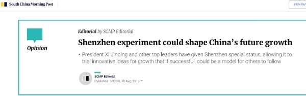 香港《南华早报》也发表社论称,深圳是中国市场改革开始的地方,因此,北京自然应该从这座城市寻找灵感,推动中国进入下一个发展阶段。中国领导人赋予了它特殊的地位,允许它尝试创新的增长理念,如果成功,可以成为其他城市效仿的榜样。深圳将有空间进行试验,以推动其“以创新为中心的发展战略”。