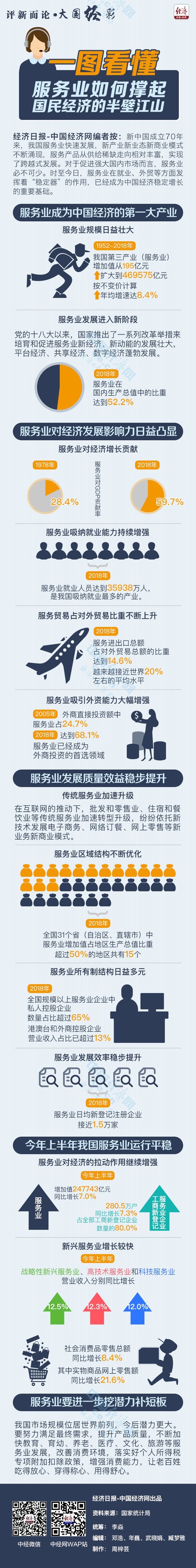 经济日报-中国经济网编者按:新中国成立70年来,我国服务业快速发展,新产业新业态新商业模式不断涌现,服务产品从供给稀缺走向相对丰富,实现了跨越式发展。对于促进强大国内市场而言,服务业必不可少。时至今日,服务业在就业、外贸等方面发挥着“稳定器”的作用,已经成为中国经济稳定增长的重要基础。