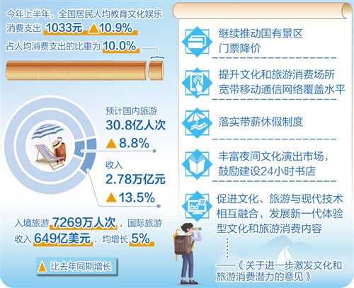 据介绍,今年上半年,全国居民人均教育文化娱乐消费支出1033元,比去年同期增长10.9%,占人均消费支出的比重为10.0%;预计国内旅游30.8亿人次,收入2.78万亿元,分别增长8.8%和13.5%;入境旅游7269万人次,国际旅游收入649亿美元,均增长5%。
