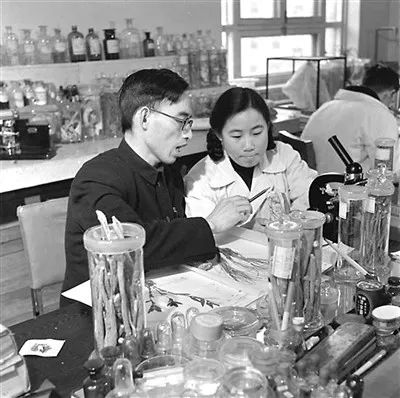 上世纪50年代,在中医研究院中药研究所任研究实习员的屠呦呦(前右)与老师楼之岑一起研究中药。