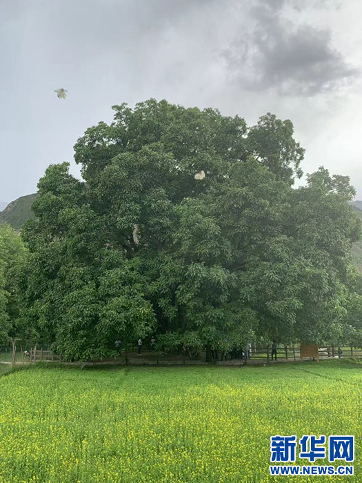 新华网拉萨8月23日电(刘子明 刘世东)22日,在西藏林芝朗县冲康村,十几个青年人手挽着手合抱一棵核桃树,丈量这棵2000多年的古树树围。遮天蔽日的树冠,犹如一轮巨大伞盖,洒下一片清凉。树影斑驳间,累累核桃果点缀在古树上,真是一片绿叶成荫子满枝的景象。
