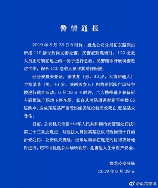 8月28日,就有两名男子贸贸然地跑到云南昆明的恒隆广场,在办公楼的66层跳伞,结果一人重伤身亡,一人被刑事拘留。