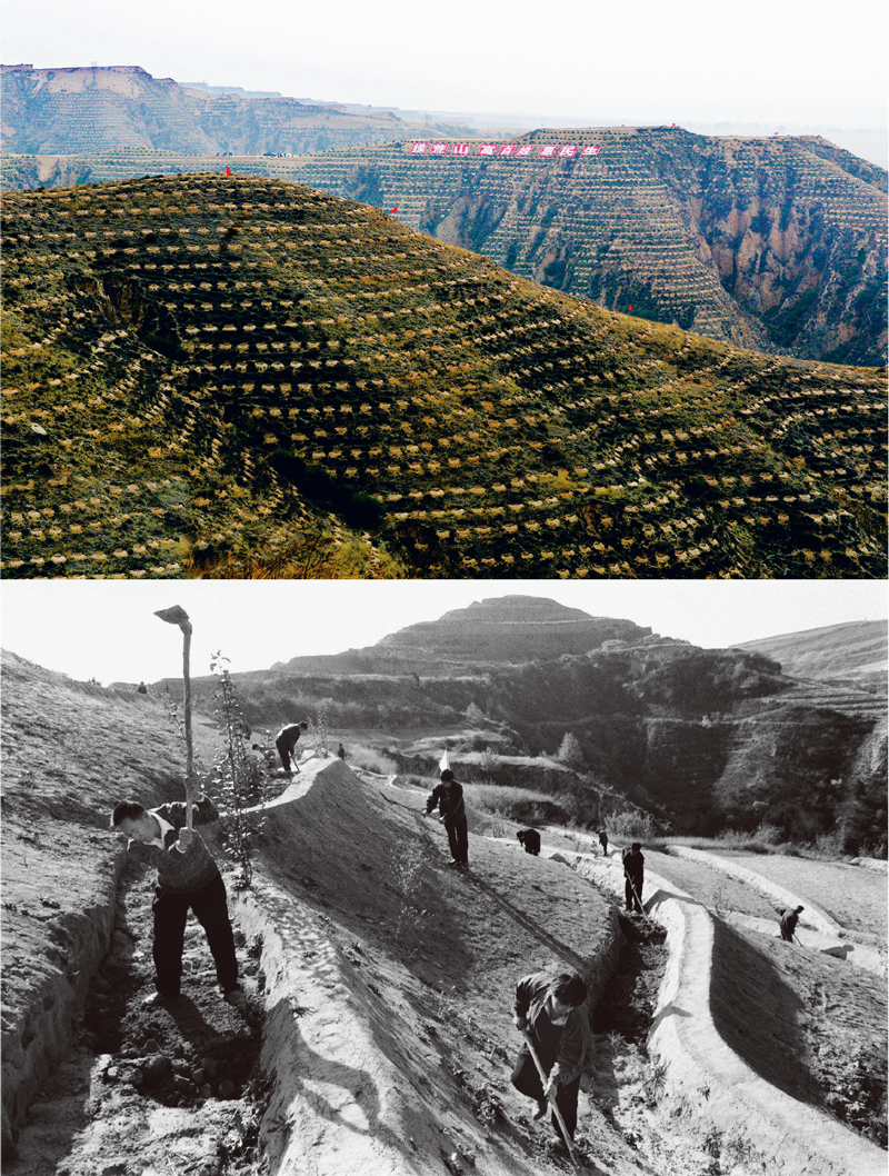位于吕梁山区深处的临汾市大宁县,地处黄土高原残垣沟壑区,是国家深度贫困县,又是限制开发的国家生态建设区。近年来,大宁深入贯彻落实习近平生态文明思想,创新实施“购买式造林”,生态环境大幅改善,在一个战场同时打赢了生态治理和脱贫攻坚两场攻坚战。上图为“绿荒山、富百姓、惠民生”的大规模造林场景(李明珠/摄)。下图为上世纪90年代大宁县农民在田间劳作(新华社记者 马毅敏/摄)。