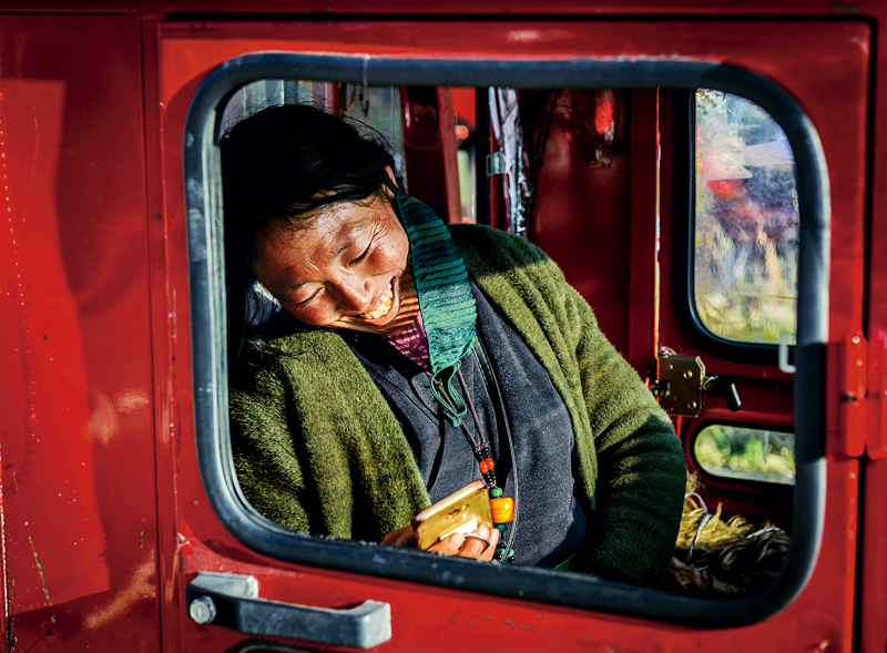 发展旅游越来越成为少数民族地区脱贫致富的重要方式。图为2018年10月的一天,四川稻城,一位街边卖藏族手工艺品的藏族妇女,接待完游客后,在小机动车驾驶室里查看手机信息,露出幸福的笑容。 视觉中国 邵小峰/摄