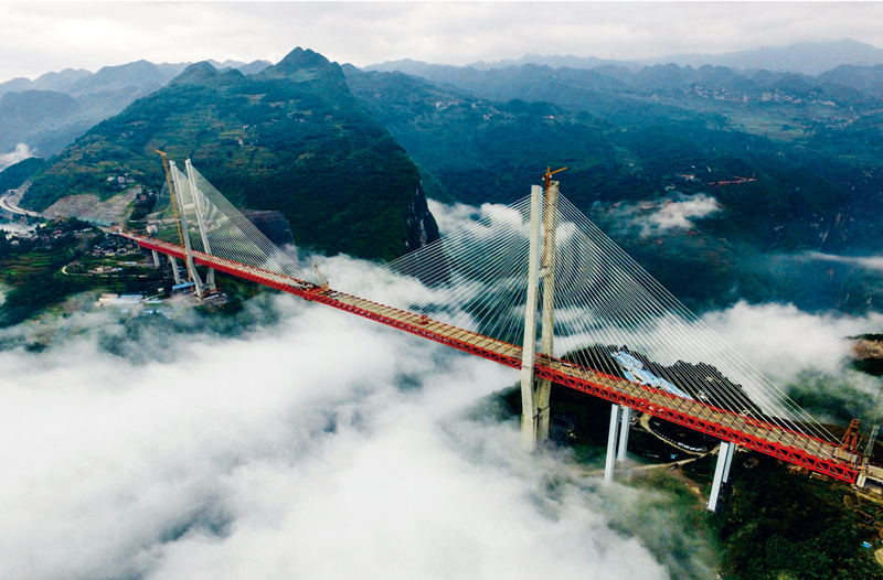 未来的路从脚下延伸。扶贫脱贫事业是一项长期的历史性任务,没有终点,只有不断开创的新起点。北盘江大桥是中国快速发展的一个缩影,它的建成极大改善了云贵地区的交通情况。图为云端俯瞰的“世界最高桥”北盘江大桥。 吴东俊/摄
