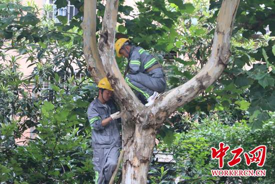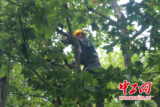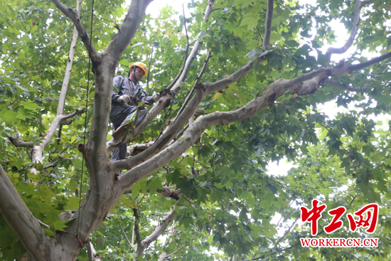 图为“蜘蛛侠”杨飞飞行道树上工作。中工网记者 朱晶晶 摄