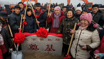 2014年12月26日,北京新机场工程正式开工建设。新机场位于北京市大兴区榆垡镇、礼贤镇和河北廊坊市广阳区之间,定位为大型国际航空枢纽,规划建设7条跑道,满足年旅客吞吐量1亿人次需求。大兴机场的奠基施工现场,航站楼的地下结构封顶,钢结构封顶,功能性封顶封围,航站楼前高架桥合龙,航站楼外立面装修工程全面完成等激动人心的时刻都浓缩在这俯瞰视角中。