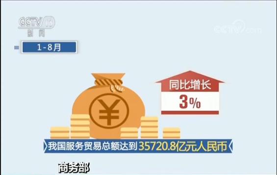数据显示,1-8月,我国服务贸易总额达到35720.8亿元人民币,同比增长3%。其中,出口12645.6亿元,增长9.7%;进口23075.2亿元,下降0.3%。