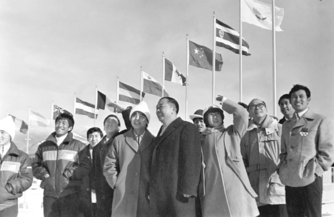1980年1月30日,五星红旗在美国普莱西德湖城冬奥会营地升起。(新华社图)