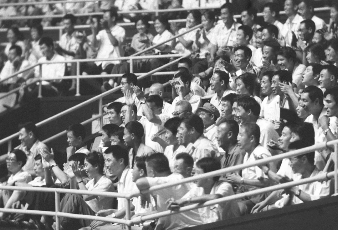 1978年,北京国际男子篮球友好邀请赛,看台上的观众热情为运动员的精湛球艺鼓掌。(新华社记者胡越摄)