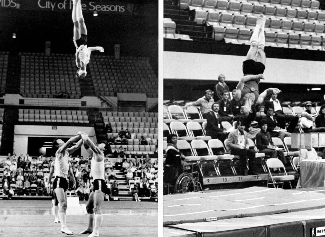 1983年10月28日,中国运动员在第四届世界杯技巧赛上获得男子四人全能冠军(左图)和男子单人全能冠军(右图)。(新华社记者顾耀铭 摄)