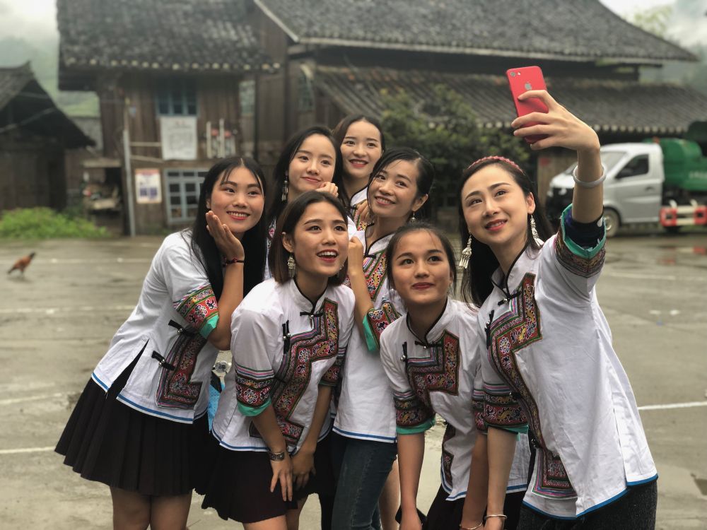 “侗族七仙女”成员在自拍。新华社记者 刘智强摄