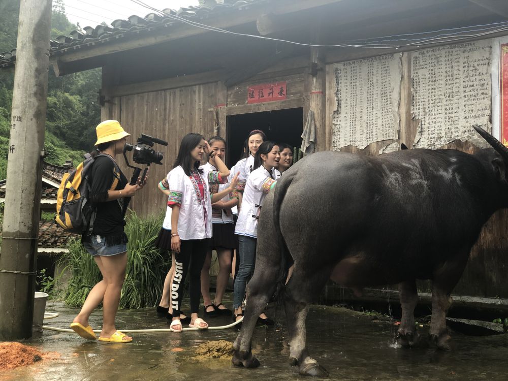“侗族七仙女”成员正在拍摄给牛冲水洗澡的短视频。新华社记者 刘智强摄