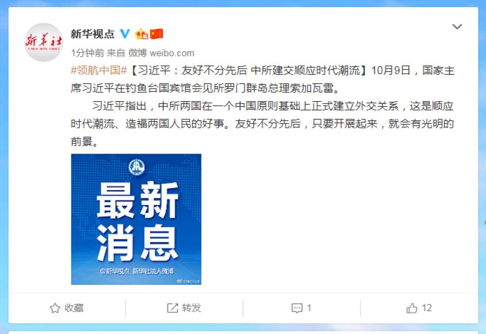 时刻新闻 —分享— 10月9日,国家主席习近平在钓鱼台国宾馆会见所罗门群岛总理索加瓦雷。习近平指出,中所两国在一个中国原则基础上正式建立外交关系,这是顺应时代潮流、造福两国人民的好事。友好不分先后,只要开展起来,就会有光明的前景。 来源:新华网 编辑:张天野