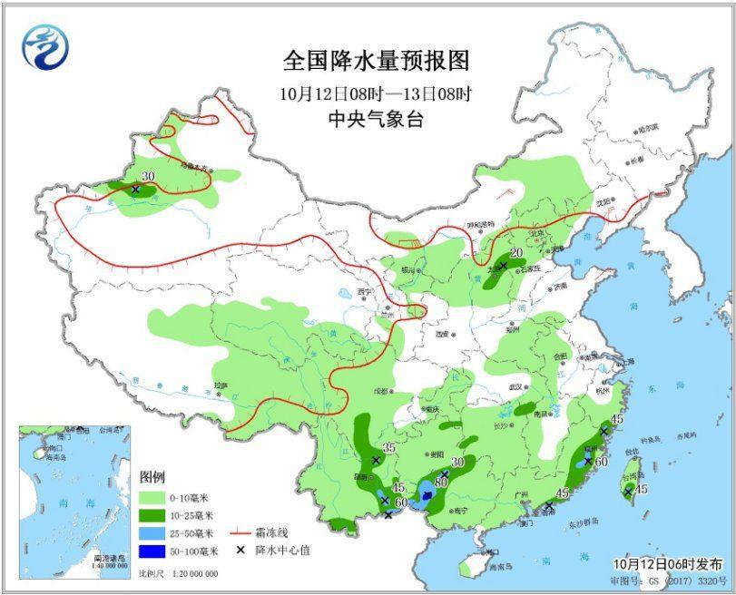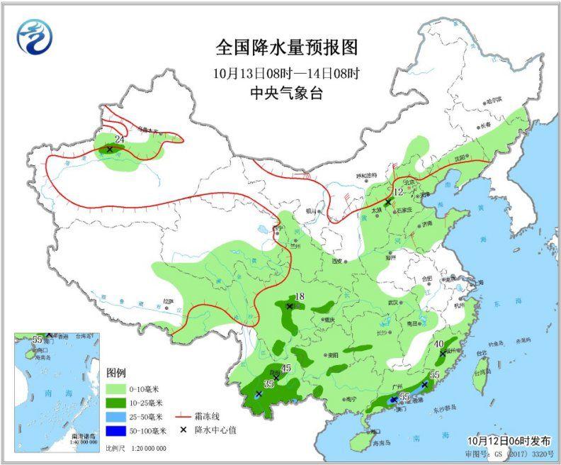 图2 全国降水量预报图(10月12日08时-13日08时)