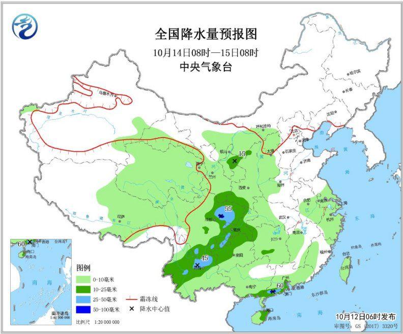10月14日08时至15日08时,西藏东北部、青海,甘肃中部等地的部分地区有小到中雪或雨夹雪,局地大雪。西南地区东部和南部、西北地区东部、华南西部等地有中雨,其中,四川盆地中部、云南北部、广东西部等地的部分地区有大雨,局地暴雨(50~60毫米)。华北南部、黄淮、江淮、江南北部等地的部分地区有4~5级及以上风。东海西南部、台湾以东洋面、南海东北部海域有6~7级、阵风8级的东北风(见图4)。
