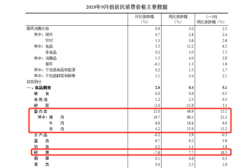 从数据看,在鲜菜价格已经下降、鲜果价格同比上涨幅度不大的情况下,畜肉类价格“涨势”较猛,带动物价指数的上升。