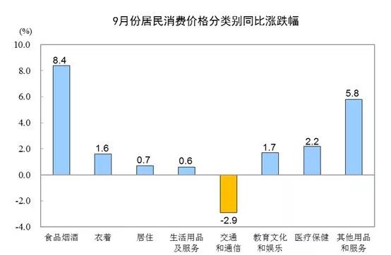 通过这张图可以看出,9月份,食品烟酒价格同比上涨8.4%,影响了CPI(居民消费价格指数)上涨约2.49个百分点。