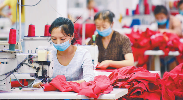 在四川省泸州市叙永县水尾镇西溪村的服装扶贫车间,贫困群众正在制作劳保服装。 李 欣摄(中经视觉)