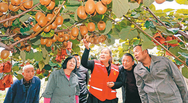 10月15日,陕西渭南三张镇铁王村猕猴桃果园里,科普讲师团农艺师为群众讲解猕猴桃管护事项,助群众早日脱贫。崔正博摄(中经视觉)