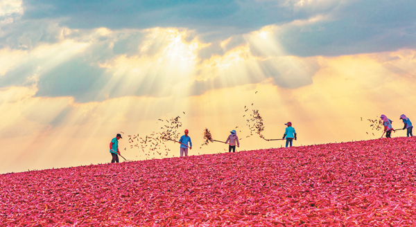 甘肃省高台县富鹏农民专业合作社的村民正在翻晒辣椒。近年来,高台县立足资源优势,科学调整农业种植结构,积极发展投资少、见效快、收益高的辣椒种植业,有力带动当地农民增收脱贫。 史家民摄(中经视觉)