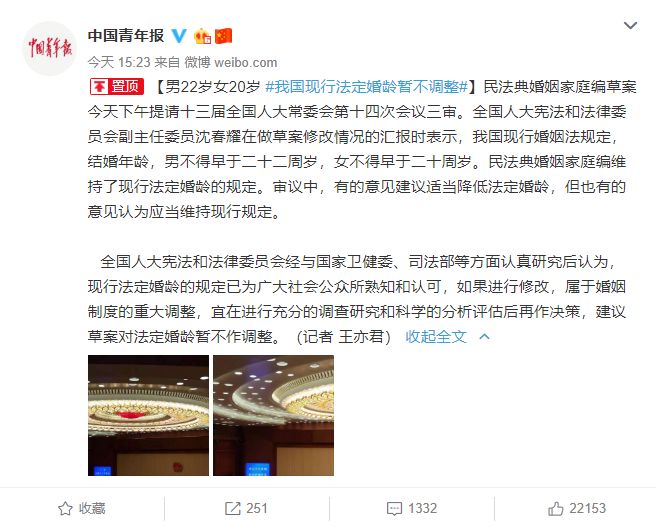 我国现行法定婚龄暂不调整的消息一出便冲上热搜!
