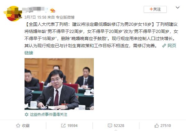 在今年的全国两会上,针对我国当下存在的人口问题,全国人大代表、贝达药业董事长丁列明指出,现行法定结婚年龄及鼓励晚婚晚育的规定已与我国当前的人口发展形势、生育政策等不相适应,建议尽快对现行婚姻法的相关条款进行修订。