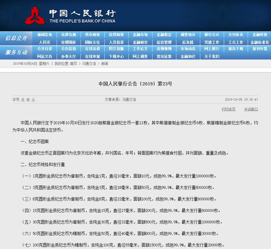 中国人民银行定于2019年10月30日发行2020版熊猫金银纪念币一套12枚,其中熊猫普制金银纪念币6枚、熊猫精制金银纪念币6枚,均为中华人民共和国法定货币。