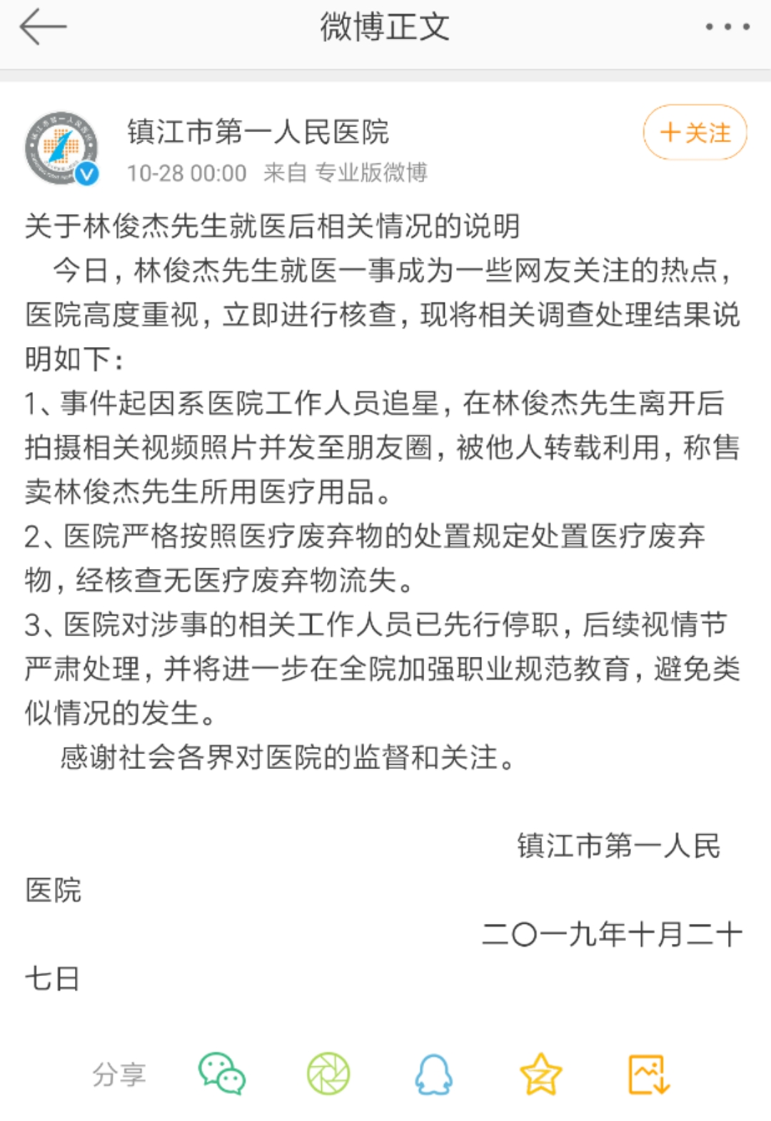 镇江市第一人民医院发布的声明称,事件起因系医院工作人员追星,在林俊杰离开后拍摄相关视频照片并发至朋友圈,被他人转载利用,称售卖林俊杰先生所用医疗用品。医院严格按照医疗废弃物的处置规定处置医疗废弃物,经核查无医疗废弃物流失。