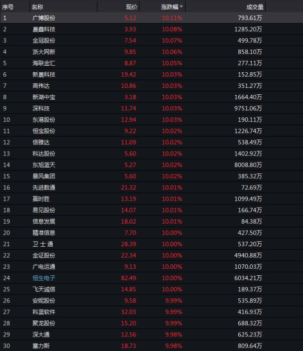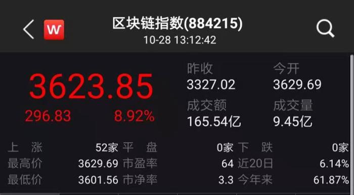 10月28日早盘,区块链概念股集体爆发,Wind区块链指数早盘上涨8.97%,涨幅位居榜首。该指数收录的52只个股早盘全线上涨,其中40只个股涨停,涨停率高达76.92%。