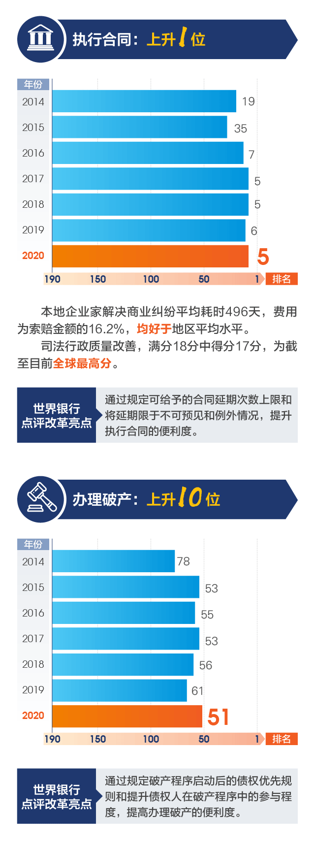 尽管如此,按照《2020年营商环境报告》,中国的“执行合同”指标还是前进1位,排名全球第5位,继续保持领先,距离排在首位的新加坡仅3.6分,超过中国台湾(第11位)、德国(第13位)、美国(第17位)和中国香港特别行政区(第31位)。其中,“司法程序质量”指数从15.5分提高至16.5分,再次被世行评价为这一领域的“全球最佳实践者”。