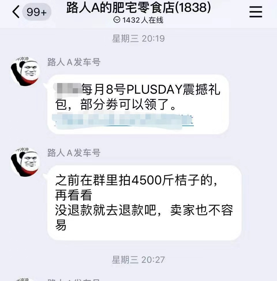 “我自己也没有在果小云下单,”“路人A-”说,在意识到给商家造成负担后,他曾在群里号召大家退款。