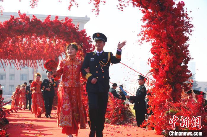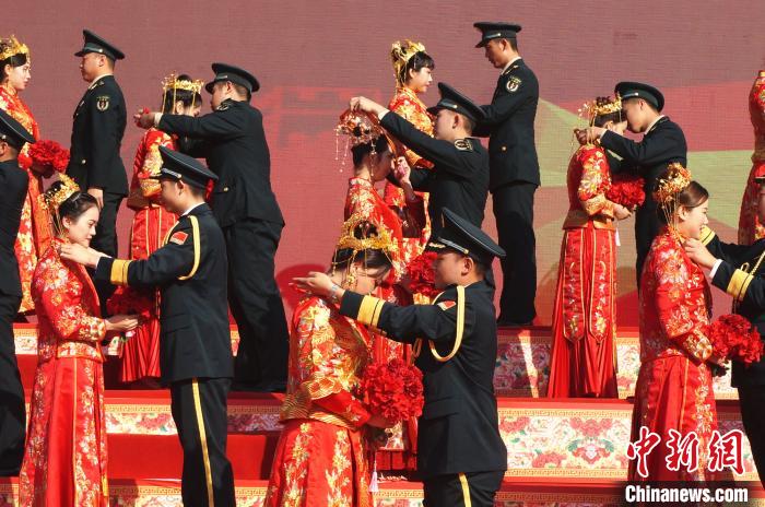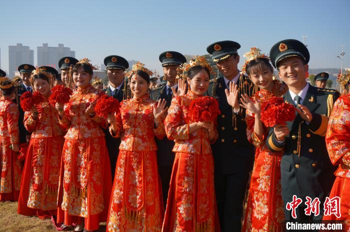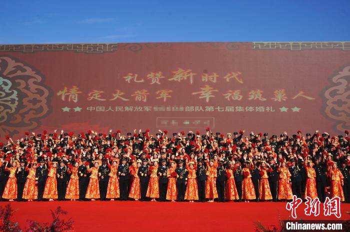 火箭军116对新人集体婚礼,新人们的脸上洋溢着幸福的笑容。 韩章云 摄