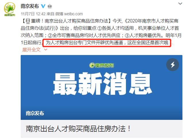 11月7日,南京出台《2020年南京市人才购买商品住房办法(试行)》,2020年1月1日起施行。