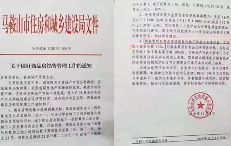 11月4日,马鞍山住建局印发184号文件显示,新备案项目商品住房销售价格不得高于备案价格,同时不得低于备案价格10%。