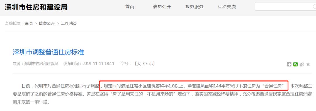 深圳住建局发布信息显示,从2019年11月11日起,普通住宅的标准不再有价格的规定,容积率在1.0以上、单套建筑面积在144平米以下的房子均为普通住宅,免征增值税。