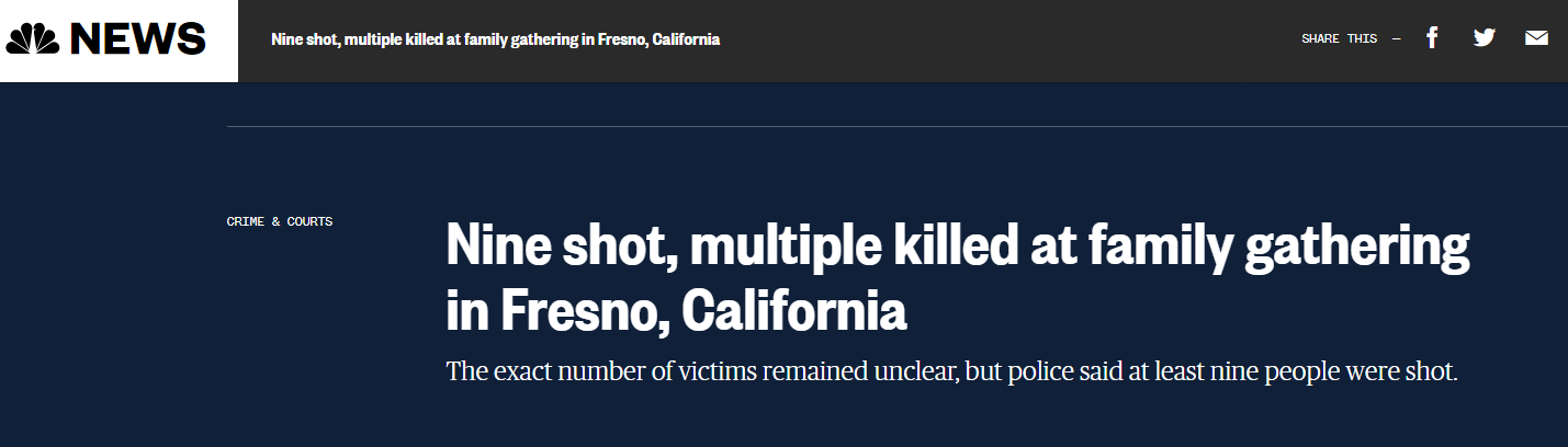 据美国媒体报道,当地时间17日晚,在加州弗雷斯诺一个家庭聚会上发生枪击案,造成多人死亡。目前具体死亡人数尚不明朗,但当地警方表示至少9人中枪。