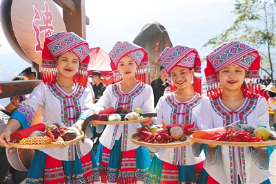 广西桂林市龙胜各族自治县龙脊古壮寨的村民在庆祝“中国农民丰收节”的活动上进行民俗展演。新华社发