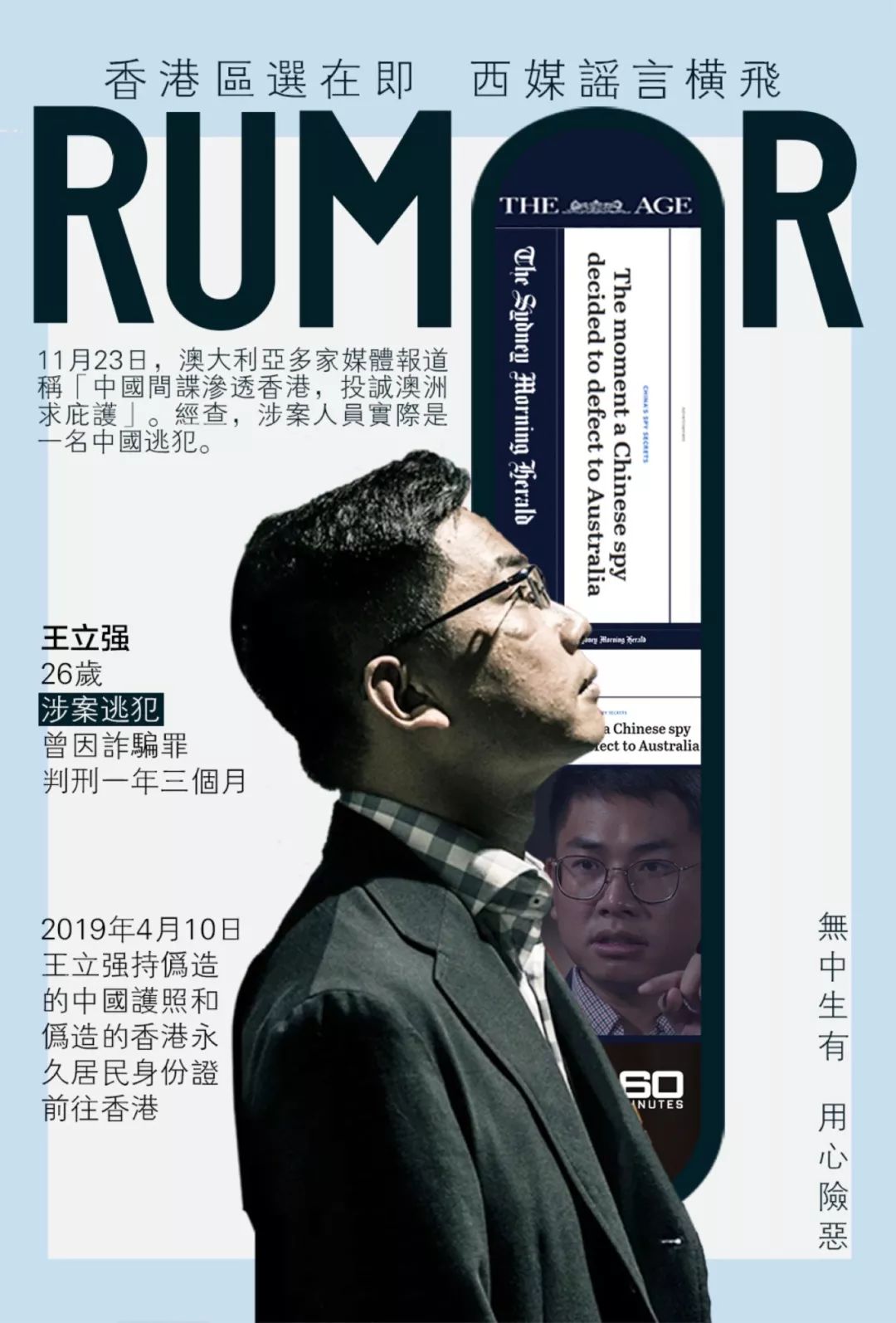 23日,澳大利亚《悉尼先驱晨报》发布消息称,“中国特工王立强叛逃澳大利亚,供称在香港、台湾为中共从事特务活动”,王立强自称持有名为王强的中华人民共和国护照(护照号EA6210226)、香港永久居民身份证(证件号Z780239)和一本韩国护照(护照号M35772699),并使用这些证件从事所谓间谍工作,部分境外媒体网站转发该报道。