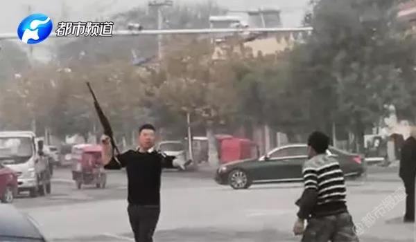 该男子举着枪,在车水马龙的县城大转盘处开启“暴走”模式。