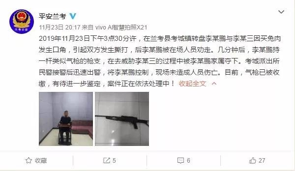 事发后,民警很快赶到现场处理,迅速控制了持枪的李某鹏,依法收缴了枪支。