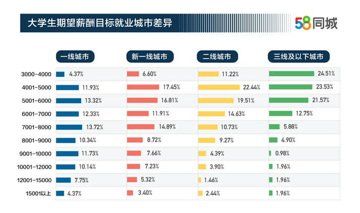 报告显示,大学生平均期望月薪为7409元,企业对大学生平均支付月薪为7094元,大学生的收入水平基本符合预期构想。大学生就业选择的城市层级越高,薪酬期望也越高。首选在一线城市就业的大学生平均期望月薪为8151元,首选在新一线城市就业的大学生平均期望月薪为7394元,首选在二线城市就业的大学生平均期望月薪为6478元,首选在三线及以下城市就业的大学生平均期望月薪为5696元。