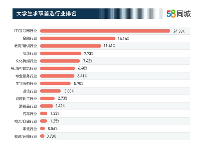 从求职首选行业上看,大学生中意的职业依次是IT/互联网、金融、教育/培训行业,其中,24.38%的大学生选择了多金又有较大发展空间的IT/互联网行业。与去年相比,IT/互联网、金融仍是最受大学生喜爱的行业,受在线教育、知识付费等影响,教育/培训行业上升4.85%跻身TOP3。