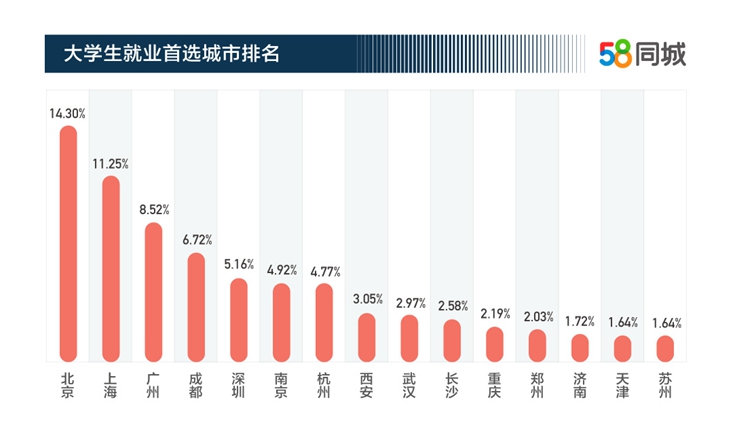 报告称,在大学生心目中,一线城市是求职的首选。大学生求职理想城市排序依次是北京、上海、广州、成都、深圳。与去年相比,北京、上海、深圳的热度有所下降,成都、南京、长沙、重庆、郑州、济南、苏州热度有所上升。今年第三季度,成都GDP增幅达到8.1%,排名全国第一,这也让大学生对成都职场更加看好。
