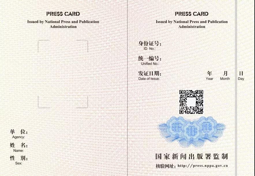 1.新版新闻记者证高107毫米,宽77毫米。红色封皮,封面凹烫印亮金色中华人民共和国国徽和“新闻记者证”中英文字样。内页共四页,其中五年年检集中在内四页。