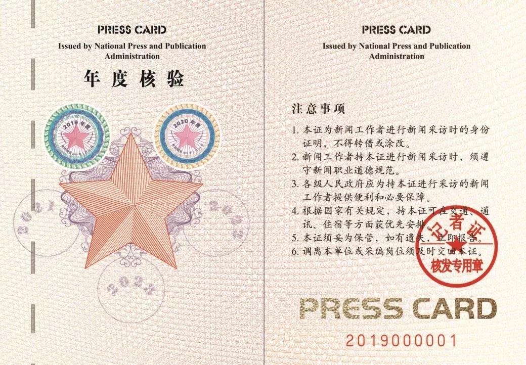 11月25日,国家新闻出版署下发《关于2019年全国统一换发新闻记者证的通知》,决定从2019年12月2日至2020年3月31日,统一换发全国新闻单位的新闻记者证。换发工作全部通过中国记者网的网络系统进行。换发期间,旧版新闻记者证继续有效使用。2020年3月31日后旧版将全部作废。2019年版新闻记者证由国家新闻出版署统一印制,不收取任何费用。