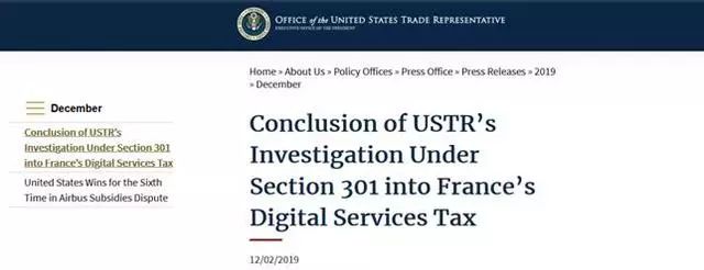 美国贸易代表办公室发布针对法国数字服务税的301调查结果认为,法国的数字服务税歧视美国公司,尤其是谷歌、苹果、Facebook和亚马逊等科技公司。