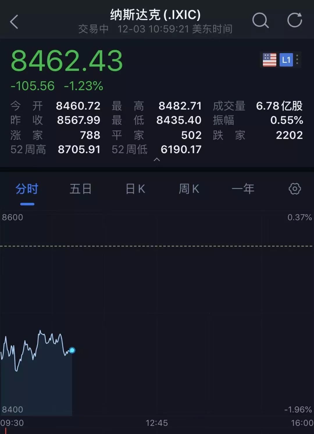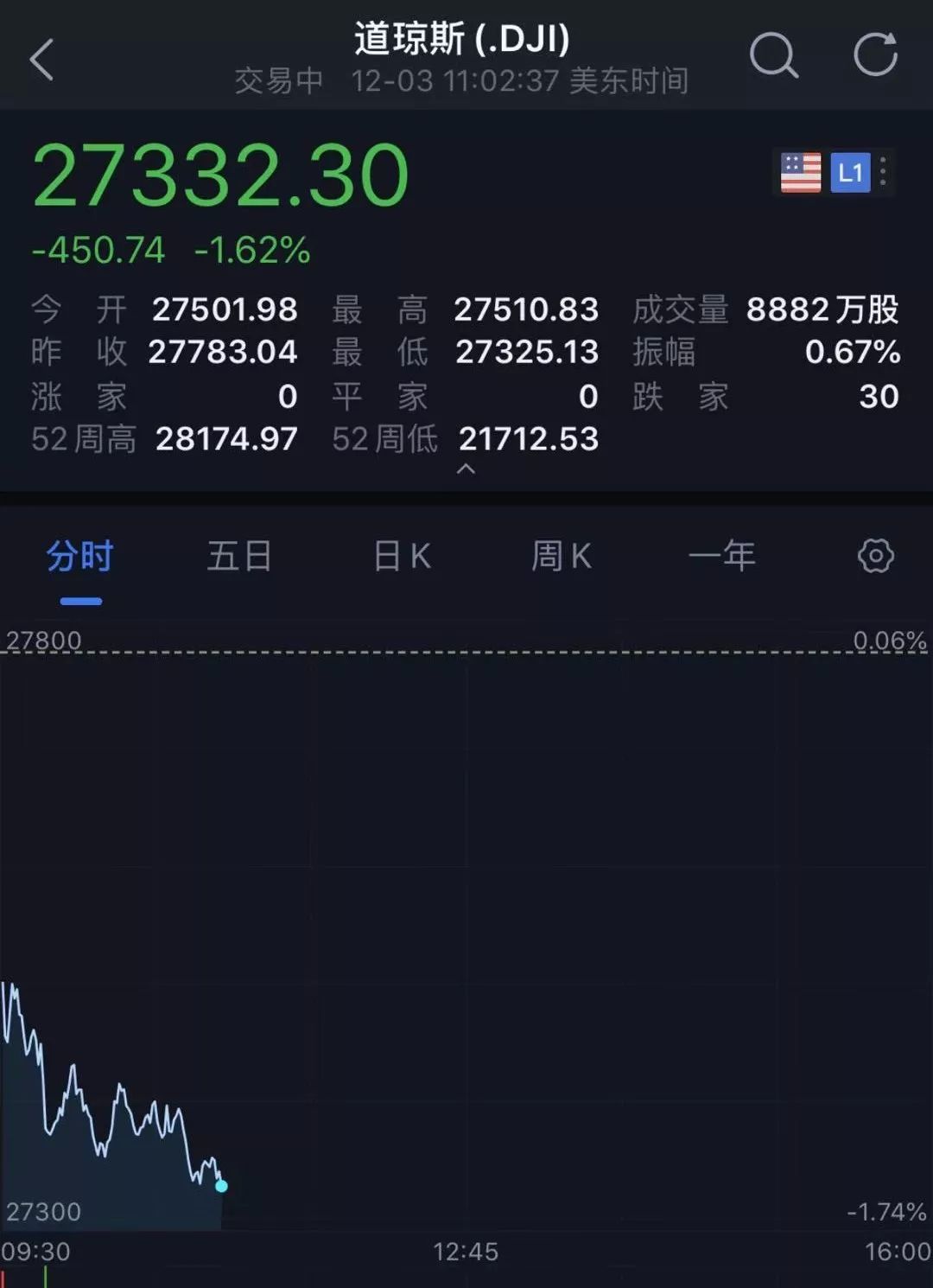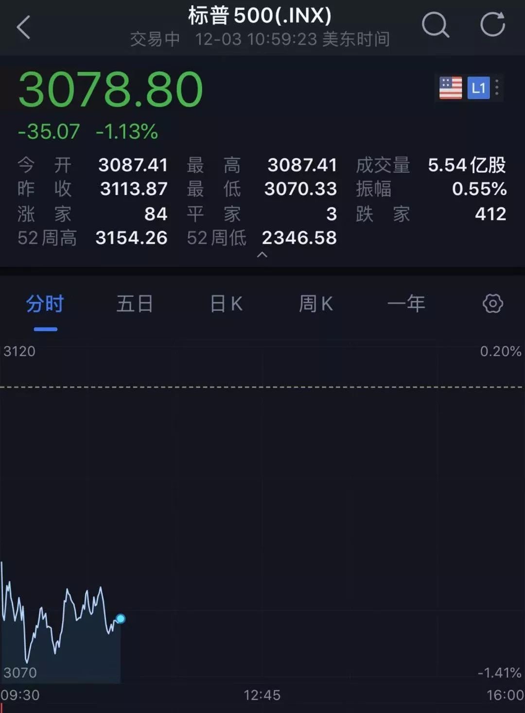北京时间12月3日深夜,美股开盘之后,暴跌逾400点,创2个月最大跌幅,三大股指均跌超1%。随后,道指跌超450点,成分股中,高盛和苹果领跌,跌2.7%,卡特彼勒、英特尔、美国运通均跌超2%;芯片类股集体下跌,高通、美光科技跌超3%。